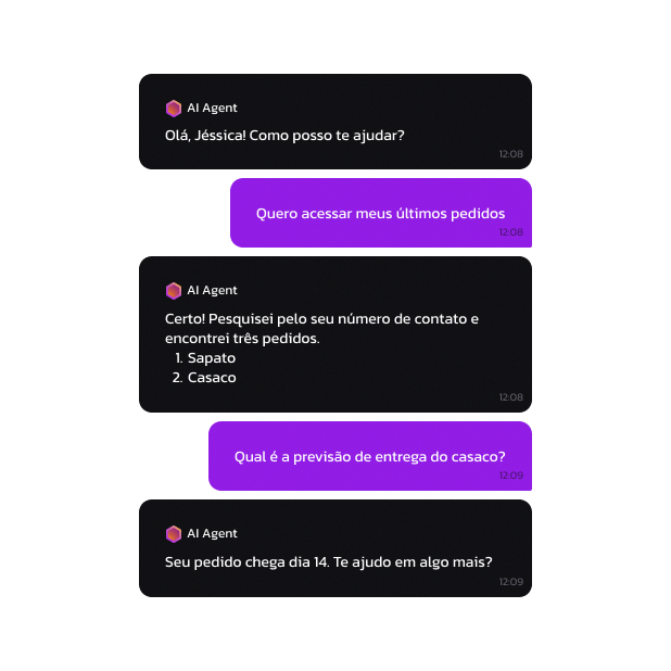 A IA executa dentro da conversa: consulta APIs, coleta dados e entrega o resultado sem transferir. Nos casos humanos, vira copiloto: sugere respostas e mantém o contexto em tempo real.
